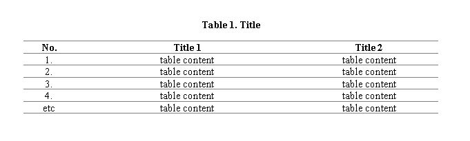 Each table or figure is numbered sequentially. The title of the table must represent the contents of the table and figures written in the middle. Sources of Tables and Figures must be listed.